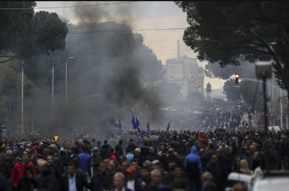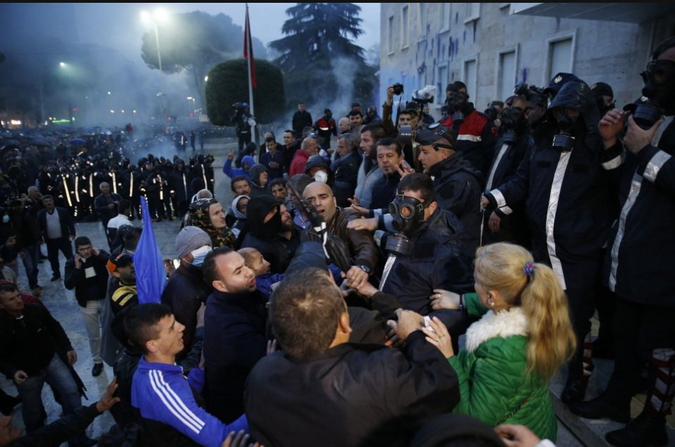 Тисячі прихильників опозиції з усієї країни з'явилися на головному бульварі Тирани з антиурядовими плакатами і гаслами, кидаючи в поліцію файєри, петарди і інші предмети.