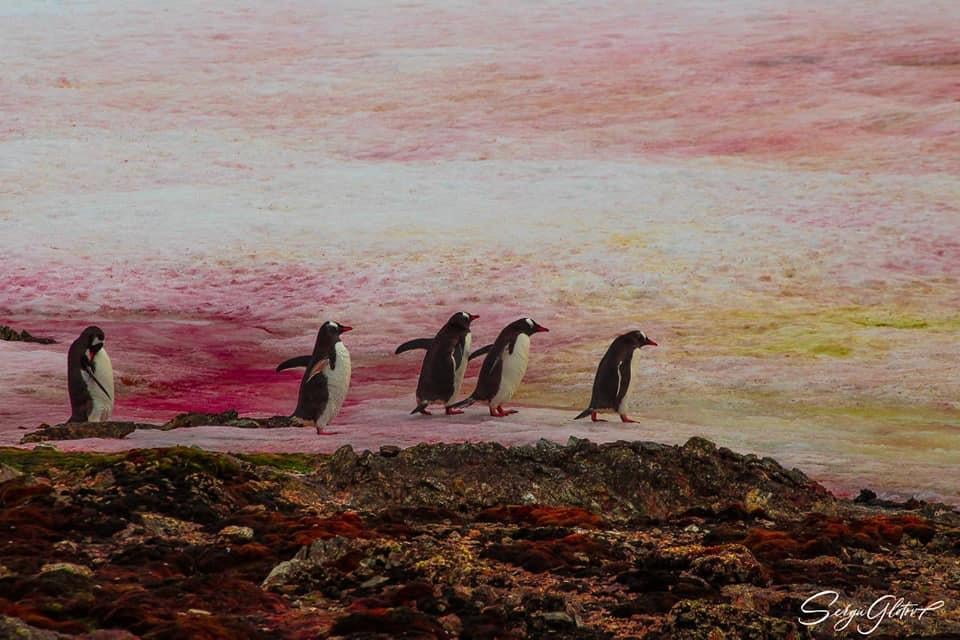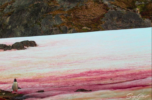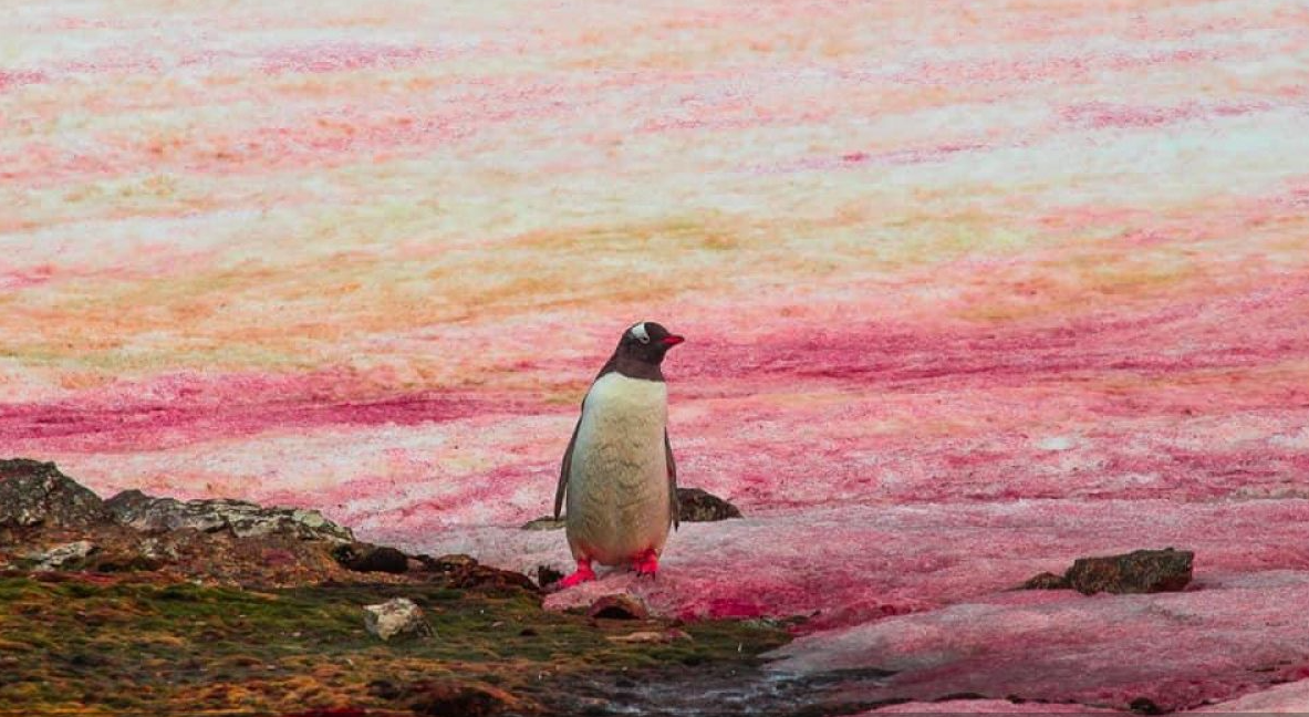 В Антарктиці біля української станції «Академік Вернадський» сніг став рожевого кольору. За словами вчених, рожеві візерунки на білому покриві – це «цвітіння» снігу наприкінці антарктичного літа.