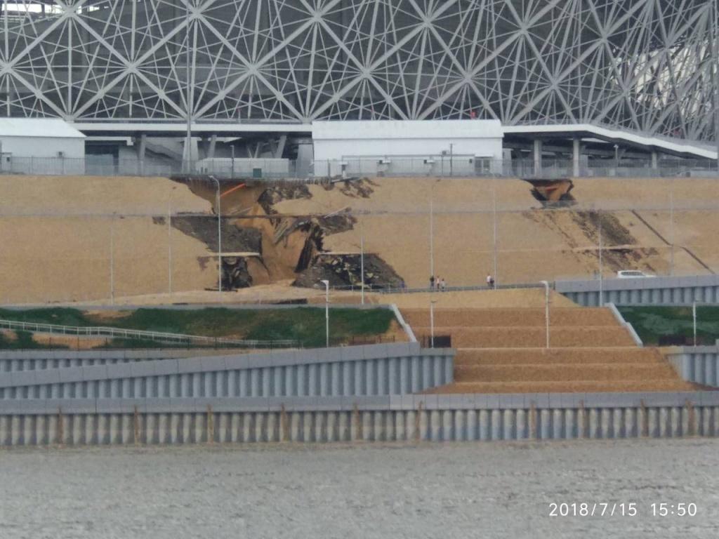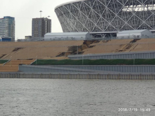 Перший же дощ у Волгограді змив не тільки нову дорогу, відкриту до ЧС-2018, але і схил біля стадіону «Волгоград-Арена», який активно розбудовували останні місяці, на очах у всього міста.
