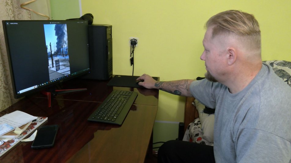 «Люди ходять по своїх справах, раз приліт, когось вбило, двоє лежать, накрили їх чимось та й далі пішли. Ніхто нікого не прибирає, швидкої та пожежників не має. Хата горить, люди йдуть і не вертаються», – говорить Дмитро Нілов.Дмитро Нілов показує фотографії наслідків обстрілів Рубіжного.