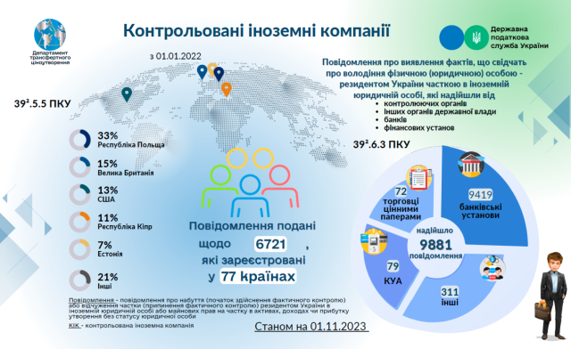 Крім того, ДПС отримала 9881 повідомлень про факти володіння фізичною (юридичною) особою-резидентом України часткою в іноземній юридичній особі.