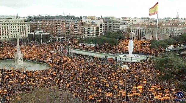 Десятки тисяч людей у неділю вийшли в центр Мадрида на заклик правоцентристських партій, які виступають проти «політики діалогу» прем’єр-міністра Педро Санчеса з урядом Каталонії.