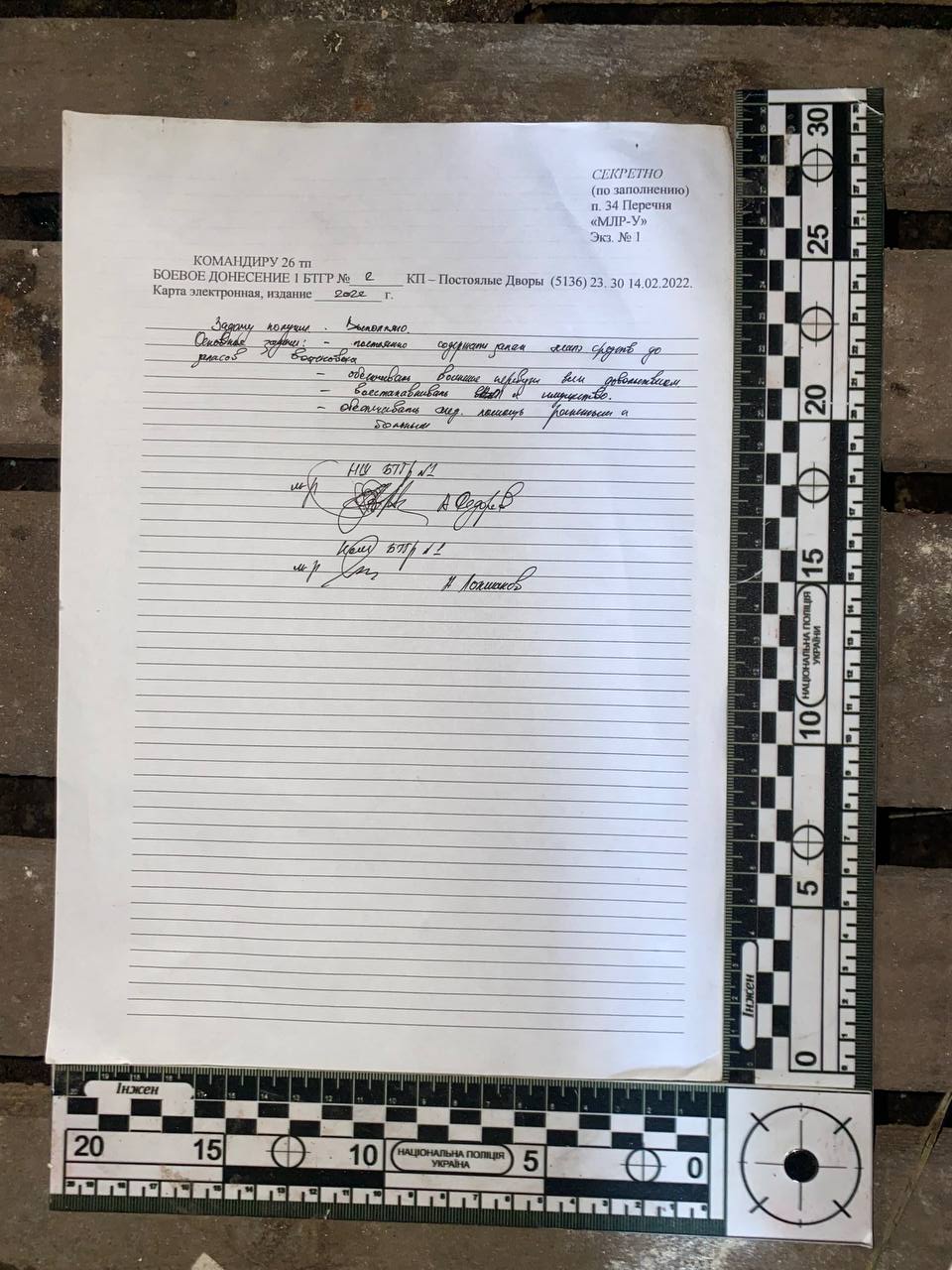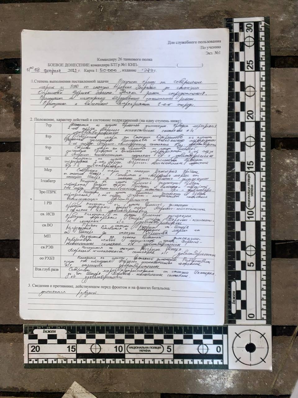 Серед виявлених речових доказів – секретне бойове розпорядження військових рф на вторгнення в Україну, топографічна карта Харківської області з маршрутом руху, списки особового складу військовослужбовців танкових бригад збройних сил рф, документи структурних підрозділів ВГА Ізюмського району, навчальних закладів, медичних закладів, підприємців та комунальних підприємств.
