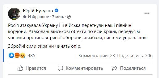 Журналіст Юрій Бутусов зазначає, що атака розпочалась на військові об'єкти по всій країні.Журналіст Андрій Цаплієнко опублікував хронологію нападу.Відео з’явилось в соцмережах. За попередньою інформацією під удар потрапила одна з військових частин в Харкові.В районі Маріуполя помітили роботу системи залпового вогню «Град».Також ЗМІ повідомляють про звуки вибухів в столиці України, зокрема поблизу аеропорту Бориспіль. Мер міста повідомив, що це працювала наша армія.