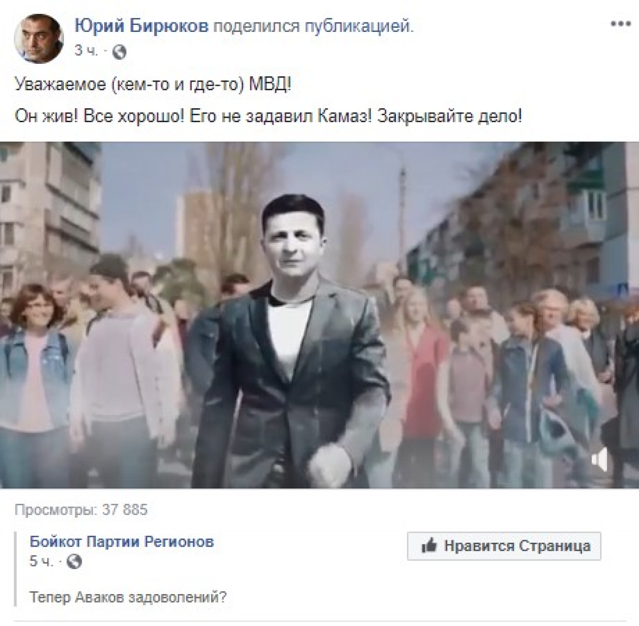 Він поширив ролик, написавши: «Шановне (десь і кимось) МВС. Він живий! Все добре! Його не задавив КАМАЗ. Закривайте справу».