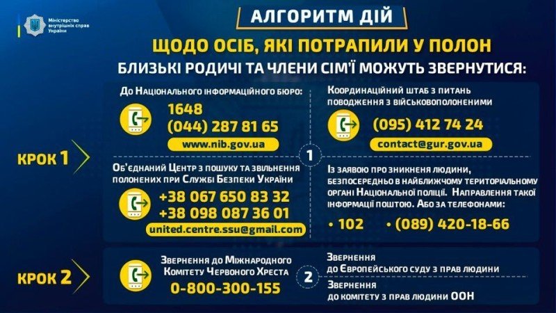 Також для отримання або надання інформації громадяни можуть звернутися до Об’єднаного Центру з пошуку та звільнення полонених при Службі безпеки України. Це можна зробити за телефонами +38 067 650 83 32, +38 098 087 36 01 або надіславши запит на електронну пошту [email protected].