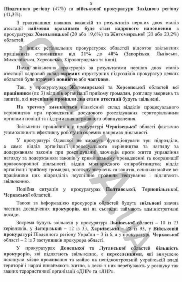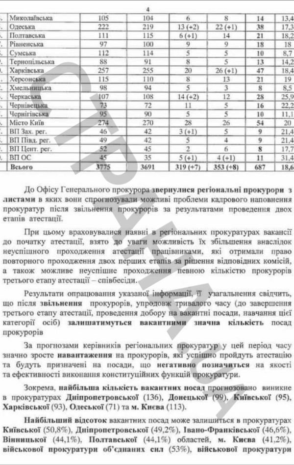 Згідно з довідкою, якщо виконати вимогу чинного закону і звільнити всіх прокурорів в областях, які не пройшли етапи атестації часів Рябошапки, то майже у всіх регіонах країни кадровий склад скоротиться мінімум на третину. Більше того, в деяких областях на окремих важливих напрямках взагалі не буде кому працювати. До прикладу, в Одеській області залишився повністю знекровленим важливий відділ із нагляду за органами, які розслідують злочини проти життя і здоров’я, пише "Страна".