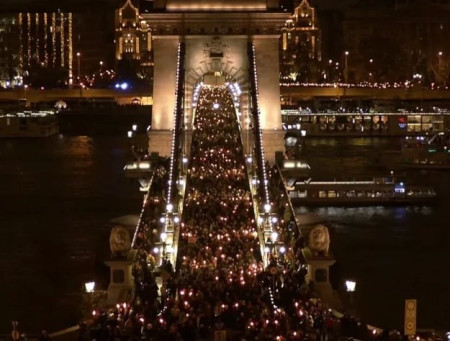 Протестувальники пройшли морозними вулицями Будапешта за банером із написом «Захистіть дітей!», несучи м’які іграшки та факели на знак солідарності з жертвами фізичного насильства у справі, яка тягнеться вже кілька років.