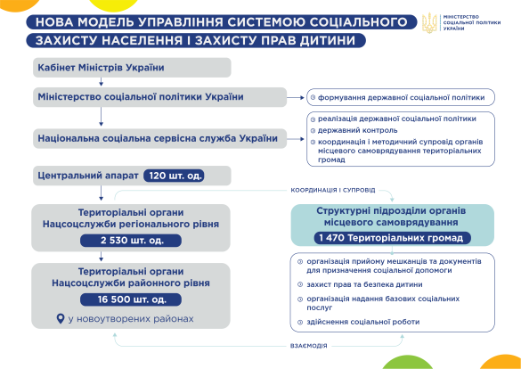 Водночас планується створити територіальні органи Нацсоцслужби на регіональному та субрегіональному рівнях і забезпечити безперервність та послідовність реалізації держполітики у сфері соціального захисту населення, захисту прав дітей.