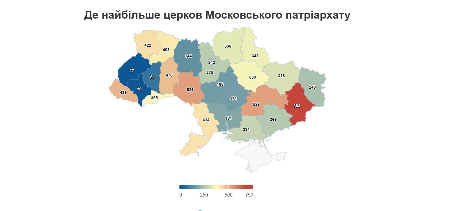 Натомість досі 8 097 церков в Україні пов’язані з країною-агресором. Найбільше таких релігійних установ на Донеччині — 683 громади. Далі йдуть Дніпропетровська та Вінницька області — по 526 церков на кожну. На Волині досі 422 церкви належать до Московського патріархату. Найменше – на Львівщині (17) та Івано-Франківщині (18).Попри таку велику кількість чинних проросійських церков лише 22 з них вказують приналежність до Московського патріархату у своєму найменуванні. Ще для 42 церков Мін’юст самостійно доповнив назви на кшталт «РЕЛІГІЙНА ОРГАНІЗАЦІЯ НЕ ВКАЗАНА ПРИНАЛЕЖНІСТЬ ДО МОСКОВСЬКОГО ПАТРІАРХАТУ» — усі з них у Чернівецькій області. До слова, ще 7 громад самостійно змінили своє найменування з примусового на попереднє. А три церкви після такого перейменування перейшли до ПЦУ.