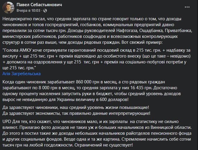 «Коли один чиновник заробляє 860 000 грн на місяць, а сто пересічних громадян заробляють по 8 000 грн на місяць, то середня зарплата у них 16 435 грн. Досить одному відсотку населення запустити руки до бюджету, щоб середній рівень доходів виріс на небачену для України величину в 600 доларів! Хай живуть чиновники, наш середній рівень життя підвищують! Хай живуть економісти, так правильно дані інтерпретують!» – написав Себастьянович.