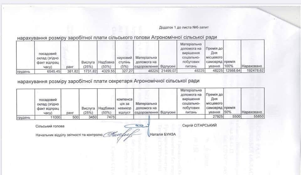 Чиновник нарахував собі 192 тисячі гривень зарплати на місяць, а своєму секретареві – 55,8 тисячі (населення села Агрономічне – 3852 особи).