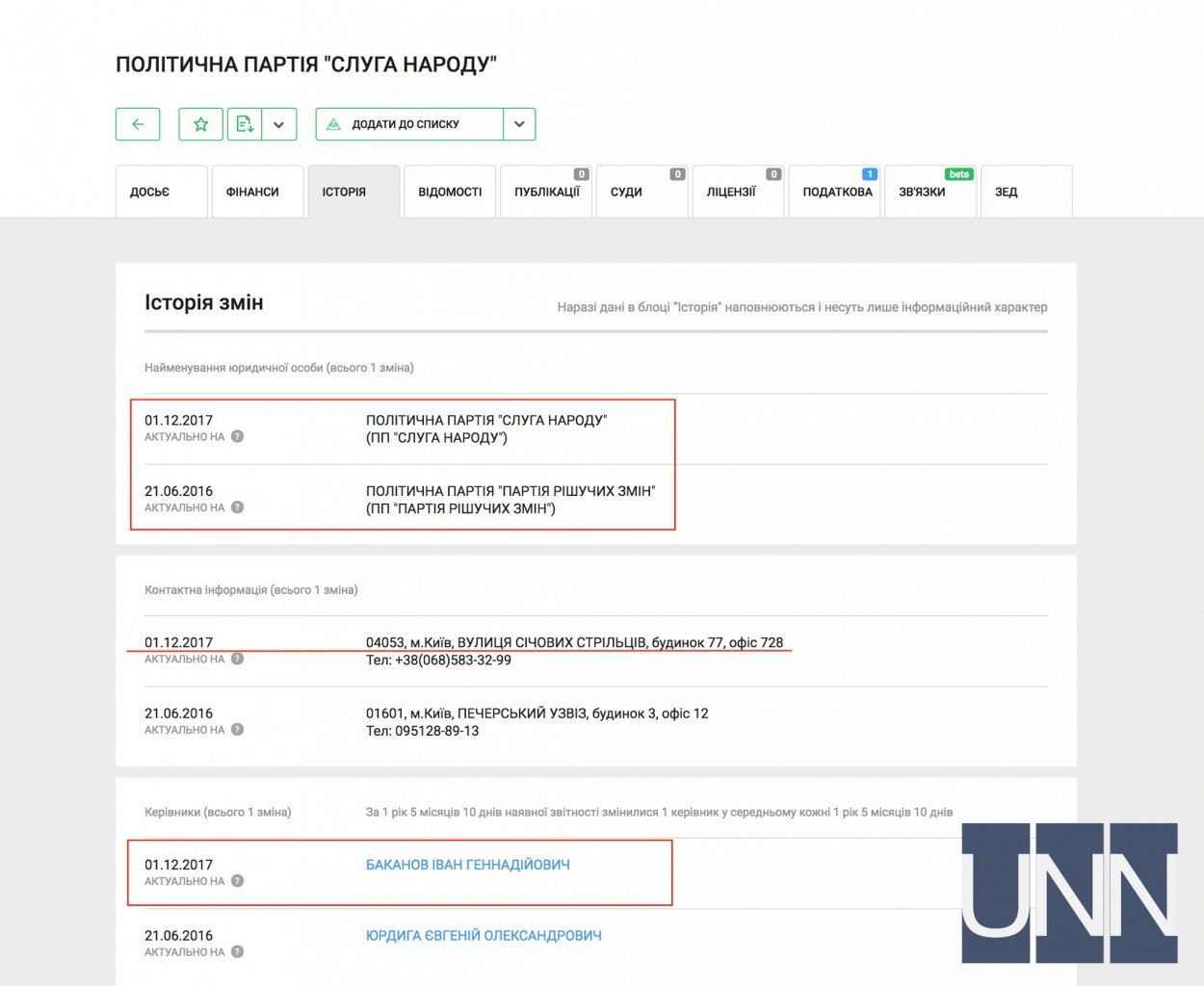 Водночас, згідно з системою YouControl, раніше “Політична Партія “Слуга Народу”” мала назву “Політична Партія “Партія Рішучих Змін””.