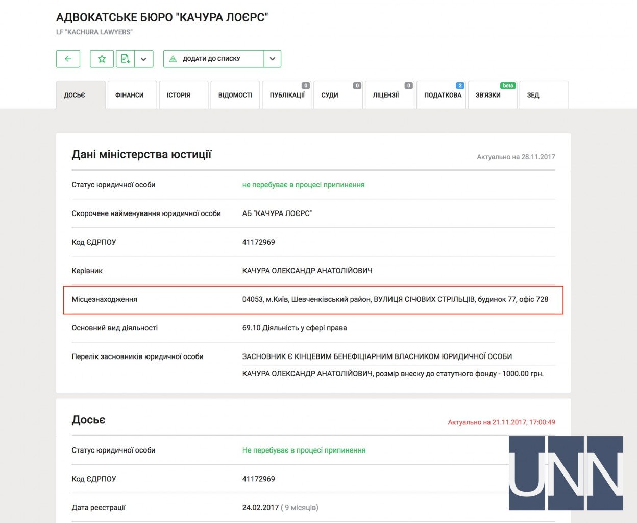 Водночас, як зазначається на сайті аналітичної системи YouControl, така сама адреса вказана як місце реєстрації приватного юридичного бюро “Качура Лоєрс”.