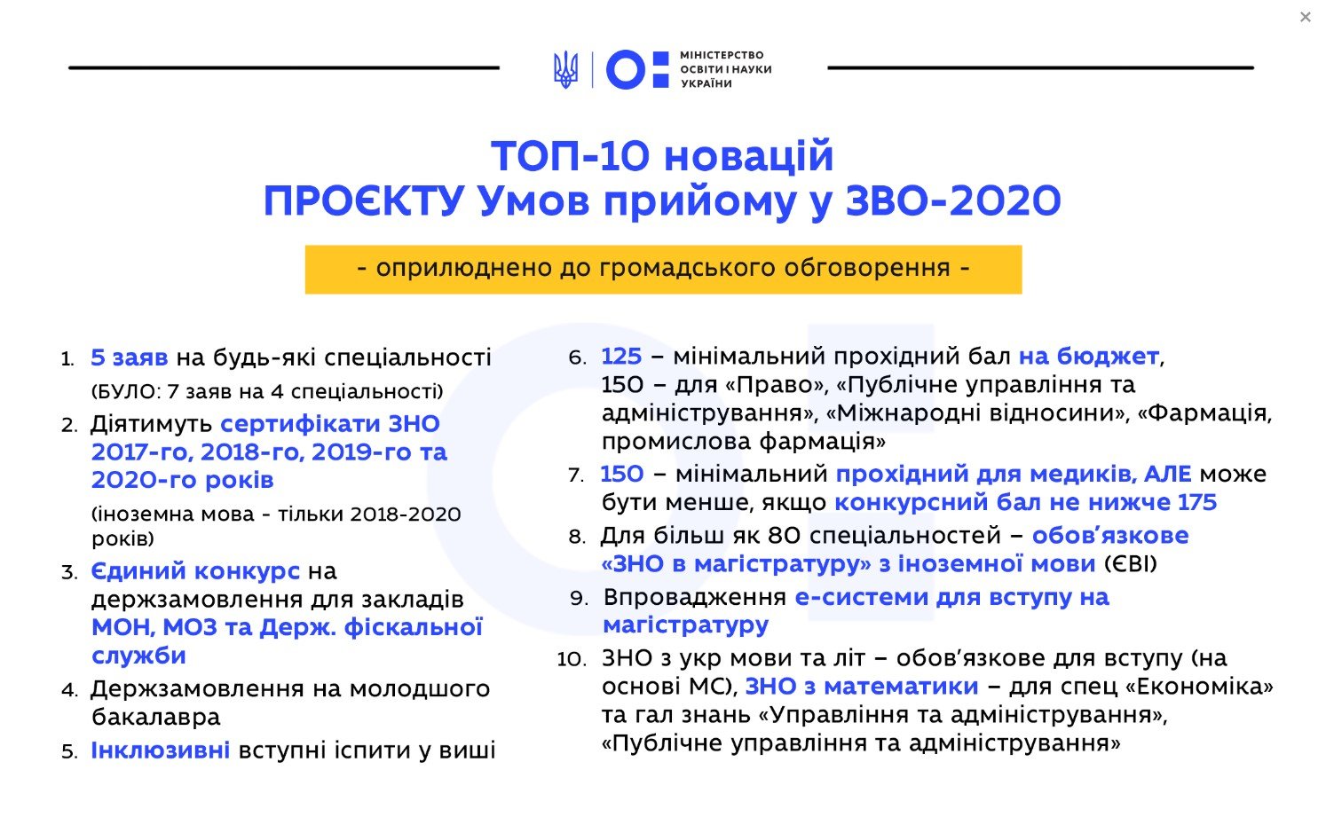 Мінімальні зміни в строках вступної кампанії, більша увага до вступників з особливими освітніми потребами, поширення практики подачі заяв через електронні кабінети. Ці та інші новації увійшли в проєкт Умов прийому до вишів на 2020 рік, опублікованому 28 серпня на сайті Міністерства освіти і науки, передає УНН.