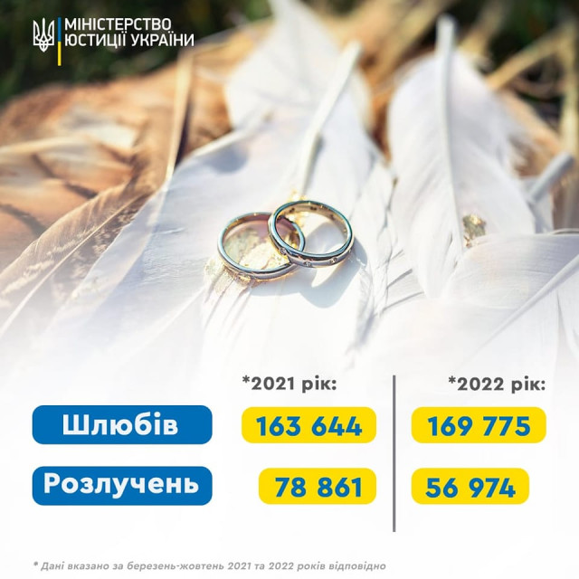 В Україні за останні 8 місяців зареєстрували майже втричі більше шлюбів, ніж розлучень. У період з березня по жовтень 2022 року одружилися понад 169 тисяч пар, а розлучилися – понад 56 тисяч.