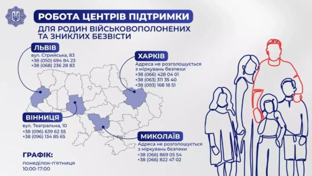 «У Львові, Миколаєві, Вінниці та Харкові сьогодні розпочали роботу Центри підтримки родин військовополонених і зниклих безвісти, де громадяни зможуть отримати допомогу та необхідну інформацію», – зазначили у МВС.