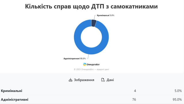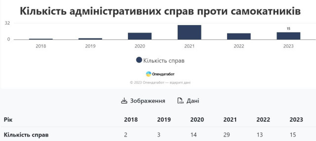 Проте здебільшого самокатників притягують до адміністративної відповідальності. За порушення ПДР та пошкодження транспортних засобів або іншого майна вони виплачують штраф у розмірі 850 гривень.Кількість адміністративних справ проти самокатників