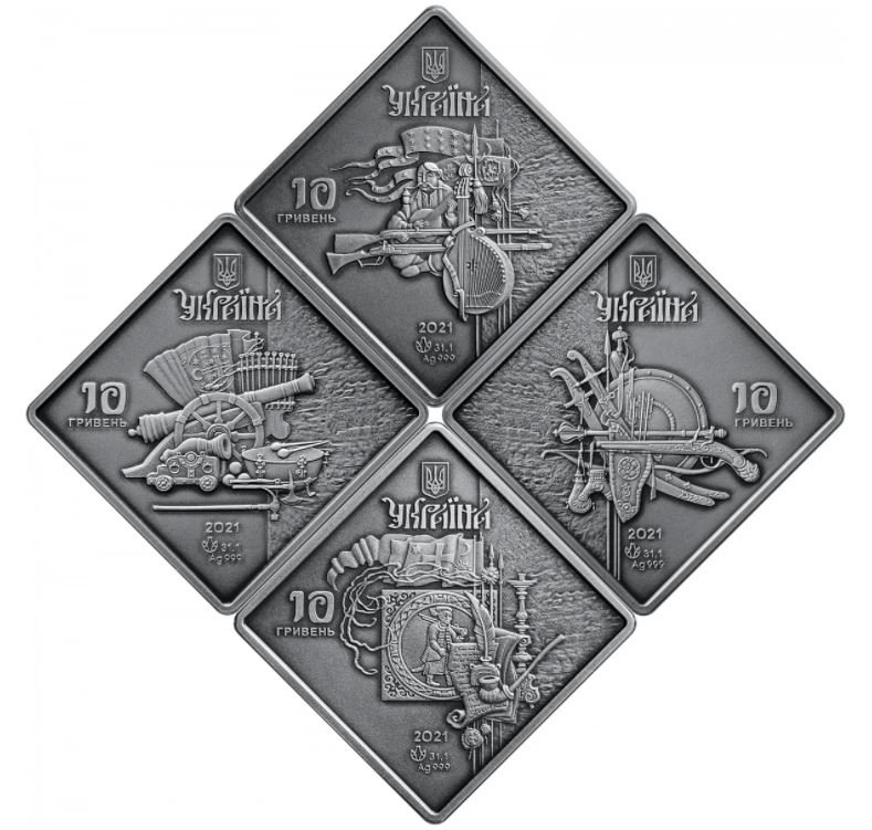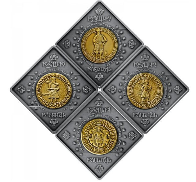 Доступним для продажу стане набір з чотирьох монет «Козацькі клейноди», вироблених зі срібла. Їх продаватимуть у футлярі з флоковим покривом у сувенірній упаковці та у дерев`яному футлярі.