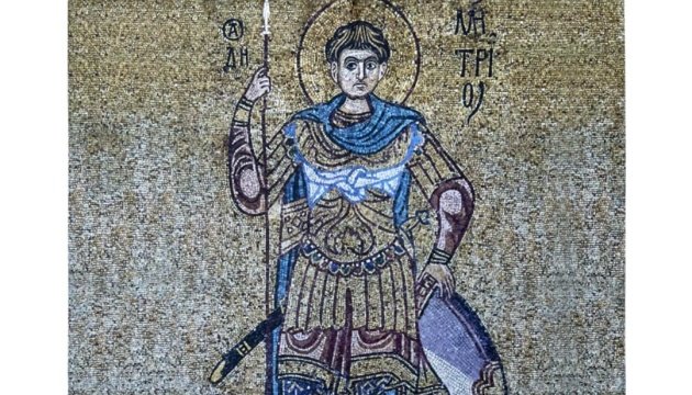 На одній із хусток зображено мозаїку «Святий великомученик Димитрій Солунський», яку створив невідомий художник у 12 ст. для Свято-Михайлівського Золотоверхого монастиря. У 1937 році радянська влада підірвала собор, а демонтовану мозаїку вивезли до Москви. Сьогодні вона перебуває у Третьяковській галереї.