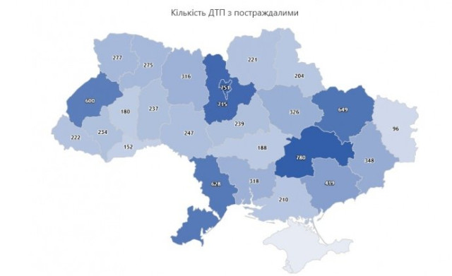 Згідно з даними Нацполіції, у «топ» областей з найбільшою кількістю ДТП з постраждалими потрапили Дніпропетровська область (780), місто Київ та Київська область (715 та 751 відповідно), Харківська (649) та Одеська (628) області.
