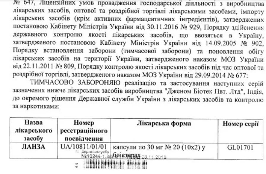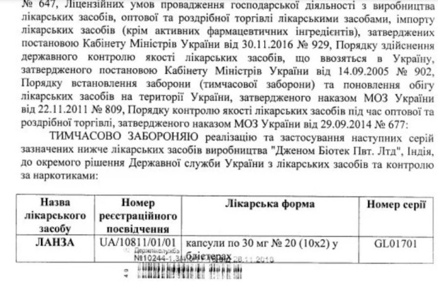 — «Ланза» капсули по 30 мг № 20 (10×2) у блістерах серій GL01701. Показання — пептична виразка шлунка та дванадцятипалої кишки, гастроезофагеальна рефлюксна хвороба.