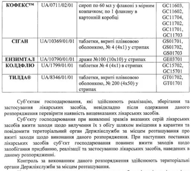 — «Ензимтал» драже № 100 (10×10) у стрипах, серій GE03701. Ліки застосовують для симптоматичного лікування диспепсії, метеоризму.