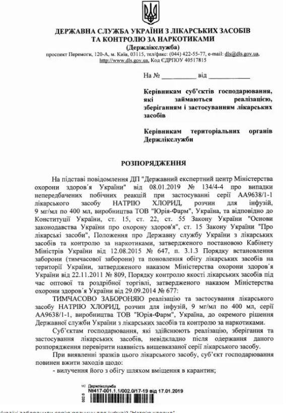 Державна служба України з лікарських засобів і контролю за наркотиками у четвер, 17 січня, тимчасово заборонила реалізацію та застосування одну серію розчину для інфузій (вливання) «Натрію хлорид».