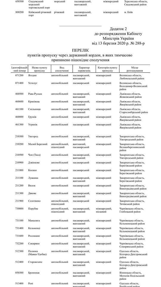 В Україні з 16 березня до 3 квітня у рамках заходів протидії поширення коронавірусу призупинять роботу 107 пунктів пропуску. З 230 чинних пунктів пропуску через державний кордон залишаються функціонувати 123.