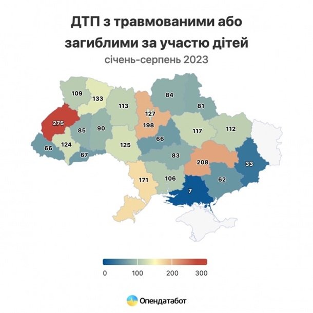 Протягом останніх трьох років незмінним лідером за кількістю ДТП з загиблими та/або травмованими, скоєними за участю дітей, залишається Львівщина. За 8 місяців 2023 року на Львівщині сталося 275 таких ДТП. Це на 12% більше до відповідного періоду 2021 року. Загалом ці показники на 10% від загальної кількості таких ДТП по країні.