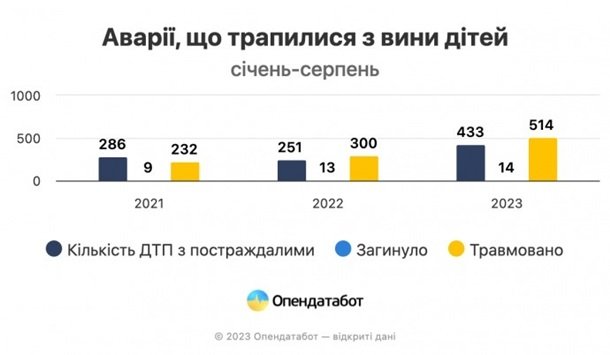 У 2023-ому суттєво збільшилася кількість ДТП із загиблими й травмованими, які трапилися саме з вини дітей – 433 таких інцидентів за вісім місяців. Це в півтора раза більше, ніж в січні-серпні 2021 року.