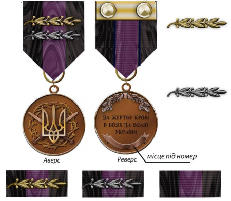 Кількість і ступінь тяжкості поранень будуть визначатися гілочками, які кріпляться на стрічці медалі або планці – біла або срібна гілочка для легких поранень, жовта або золота для важких.