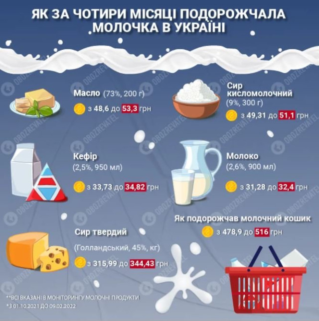 Ще у жовтні 2021-го «молочний кошик» (сир, масло, кефір, молоко) обходився українцям у 478,9 грн. А тепер за такий самий набір доведеться заплатити вже 516 грн. Наприклад: