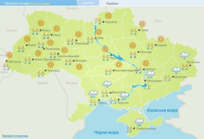 В Україні в середу, 28 листопада, без опадів, лише на півдні та сході невеликий мокрий сніг. Вітер північно-східний і північний, 7-12 м/с, в південній частині пориви 15-20 м/с. На дорогах ожеледиця.