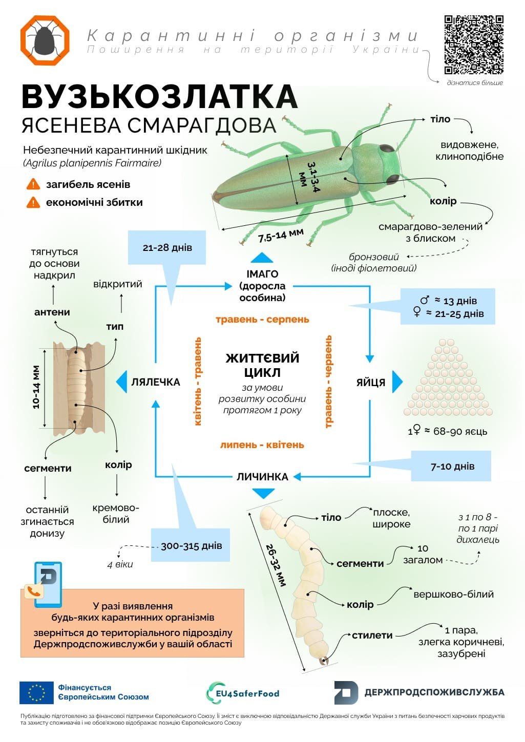 Держпродспоживслужба спільно з європейським проєктом EU4SaferFood створили інформаційні матеріали щодо ознак пошкодження, заходів боротьби та шляхів поширення вузькозлатки ясеневої.
