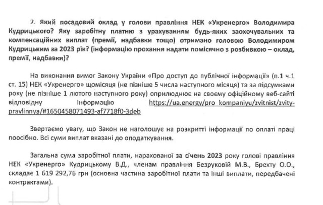 В «Укренерго» відмовились називати зарплату голови правління Володимира Кудрицького. Замість того в компанії озвучили зарплату всього правління (Кудрицький та чотири члени правління). Так, середня місячна зарплата для одного члена правління сягає понад 2 млн грн. При цьому, розмір зарплат значно відрізняється залежно від місяця.