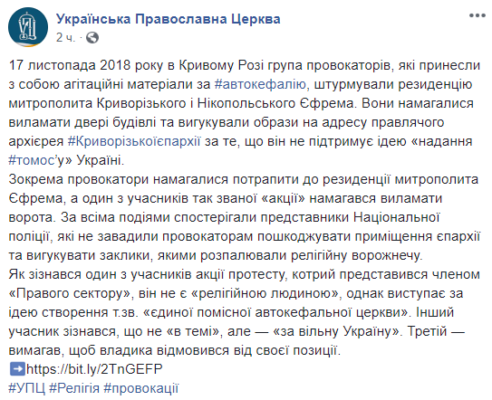 Як йдеться в дописі, невідомі намагалися потрапити до резиденції митрополита Єфрема, а один з учасників так званої «акції» намагався виламати ворота. За всіма подіями спостерігали представники Національної поліції, які не завадили провокаторам пошкоджувати приміщення єпархії та вигукувати заклики, якими розпалювали релігійну ворожнечу.