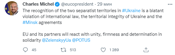 «Визнання двох сепаратистських територій в Україні є кричущим порушенням міжнародного права, територіальної цілісності України та Мінських угод. ЄС і його партнери відреагують єдністю, твердістю і рішучістю на знак солідарності з Україною», – сказано в повідомленнях.Міністр закордонних справ Великої Британії Елізабет Трасс заявила, що рішення Путіна визнати «незалежність» «ЛДНР» свідчить про кричущу зневагу зобов’язаннями Росії щодо Мінських угод.