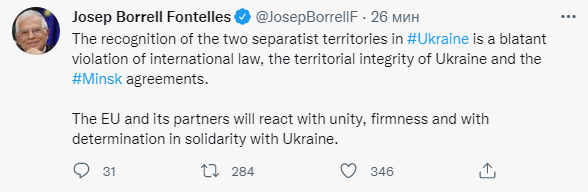 Голова Єврокомісії Жозеп Боррель, голова Євроради Шарль Мішель та керівник Європейської комісії Урсула фон дер Ляйєн назвали визнання Росією незалежності «ДНР» і «ЛНР» порушенням міжнародного права і територіальної цілісності України.