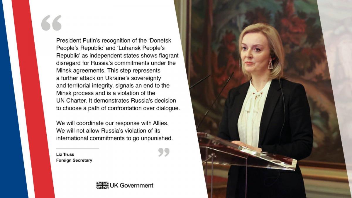 «Визнання двох сепаратистських територій в Україні є кричущим порушенням міжнародного права, територіальної цілісності України та Мінських угод. ЄС і його партнери відреагують єдністю, твердістю і рішучістю на знак солідарності з Україною», – сказано в повідомленнях.Міністр закордонних справ Великої Британії Елізабет Трасс заявила, що рішення Путіна визнати «незалежність» «ЛДНР» свідчить про кричущу зневагу зобов’язаннями Росії щодо Мінських угод.