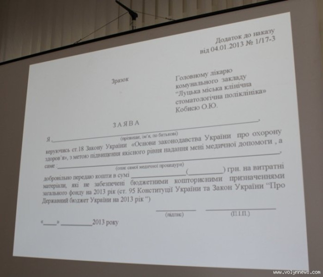 Окрім того, Федір Кошель зазначив, що для добровільної передачі коштів на рахунок медичного закладу пацієнти відтепер муситимуть заповнювати відповідну заяву, яка підтверджуватиме законність благодійного внеску та не буде оскаржена прокуратурою. Такий крок медики називають переходом до страхової медицини.
