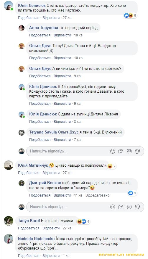 Зауважимо, у тролейбусах встановлені валідатори, у деяких з них вони вже працюють. Деякі кондуктори активно допомагають пасажирам при використанні е-квитка: якщо є валідатор, показують, як ним користуватися, якщо ні – пропонують заплатити готівкою. Дехто з них обурюється і одразу каже, щоб платили готівкою.Бувають і казуси – іноді пасажири не тим боком прикладають карту, забувають поповнити картку або намагаються розрахуватися банківською картою. Наразі це не можливо, але згодом оплатити проїзд можна буде і банківською карткою, і телефоном.
