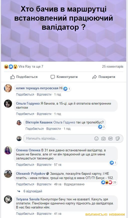 Зауважимо, у тролейбусах встановлені валідатори, у деяких з них вони вже працюють. Деякі кондуктори активно допомагають пасажирам при використанні е-квитка: якщо є валідатор, показують, як ним користуватися, якщо ні – пропонують заплатити готівкою. Дехто з них обурюється і одразу каже, щоб платили готівкою.Бувають і казуси – іноді пасажири не тим боком прикладають карту, забувають поповнити картку або намагаються розрахуватися банківською картою. Наразі це не можливо, але згодом оплатити проїзд можна буде і банківською карткою, і телефоном.