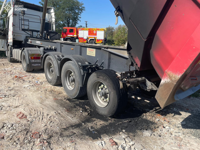 Як повідомили у ДСНС Волині, водій вивантажував щебінь із автомобіля та зачепив лінію електропередач, через що загорілись задні шини автомобіля.