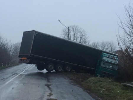 З'явилося відео ДТП, у якій вантажівка з’їхала в кювет і частково перекрила дорогу поблизу Луцька.