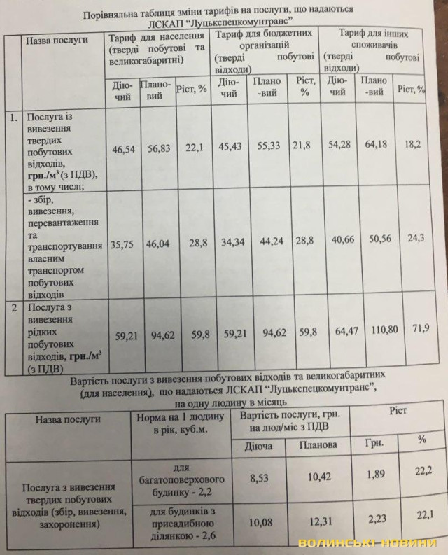 Передбачається, що вартість вивезення твердих побутових відходів для населення зросте на 22,1 %, а рідких побутових відходів – на 59,21 %.