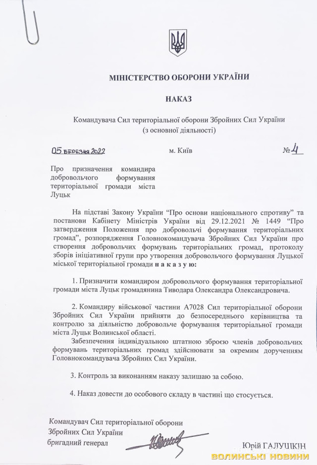 Нагадаємо, 28 лютого у Луцьку на базі ГФ «Варта порядку» створили батальйон оперативного реагування «Луцьк», до якого увійшли близько півтори тисячі учасників. Більшість з них – люди з реальним бойовим досвідом, які вміють ефективно знешкоджувати ворога. Чимало є й новачків, які проходять навчання в досвідчених інструкторів та стають до лав формування. А 5 березня командувач Сил тероборони ЗСУ генерал Юрій Галушкін підписав наказ про офіційну реєстрацію батальйону та видачу зброї його учасникам.Менше ніж за тиждень чисельність батальйону збільшилась до двох тисяч. Його підсилили підрозділами з інших волинських міст, захисники чекають лишень наказу. Також отримали сучасне озброєння і спорядження, транспорт, медикаменти тощо. Є в батальйону й надсучасні NLAW, і хлопці, що важливо, вміють справно ними орудувати. В наявності і достатня кількість приладів нічного бачення. Останні 7 днів особовий склад успішно проходив бойове злагодження, пристрілював зброю та відпрацьовував ведення бою.«Ми цілком забезпечені стрілецькою, протитанковою зброєю. У нас є кулемети, автомати, міномети. Ми також маємо ПЗРК – пересувні ракетно-зенітні комплекси, тож можемо збивати ворожу авіацію – літаки і вертольоти. Сповна забезпечені транспортом. У ворога немає жодного шансу. Відступати нам нікуди, нікого не боїмося, ми на своїй землі і будемо її боронити. А якщо ворог і прорветься, то партизанську війну ми будемо вести місяцями. Для них це буде пекло на землі», – акцентує командир добровольчого батальйону «Луцьк» Олександр Тиводар.