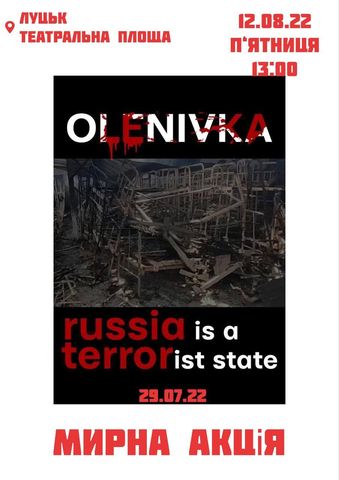 Тож у Луцьку вирішили організувати мирну акцію задля привернення уваги світової спільноти до теракту в Оленівці, який здійснили російські загарбники. Акція відбудеться на Театральному майдані 12 серпня о 13.00.