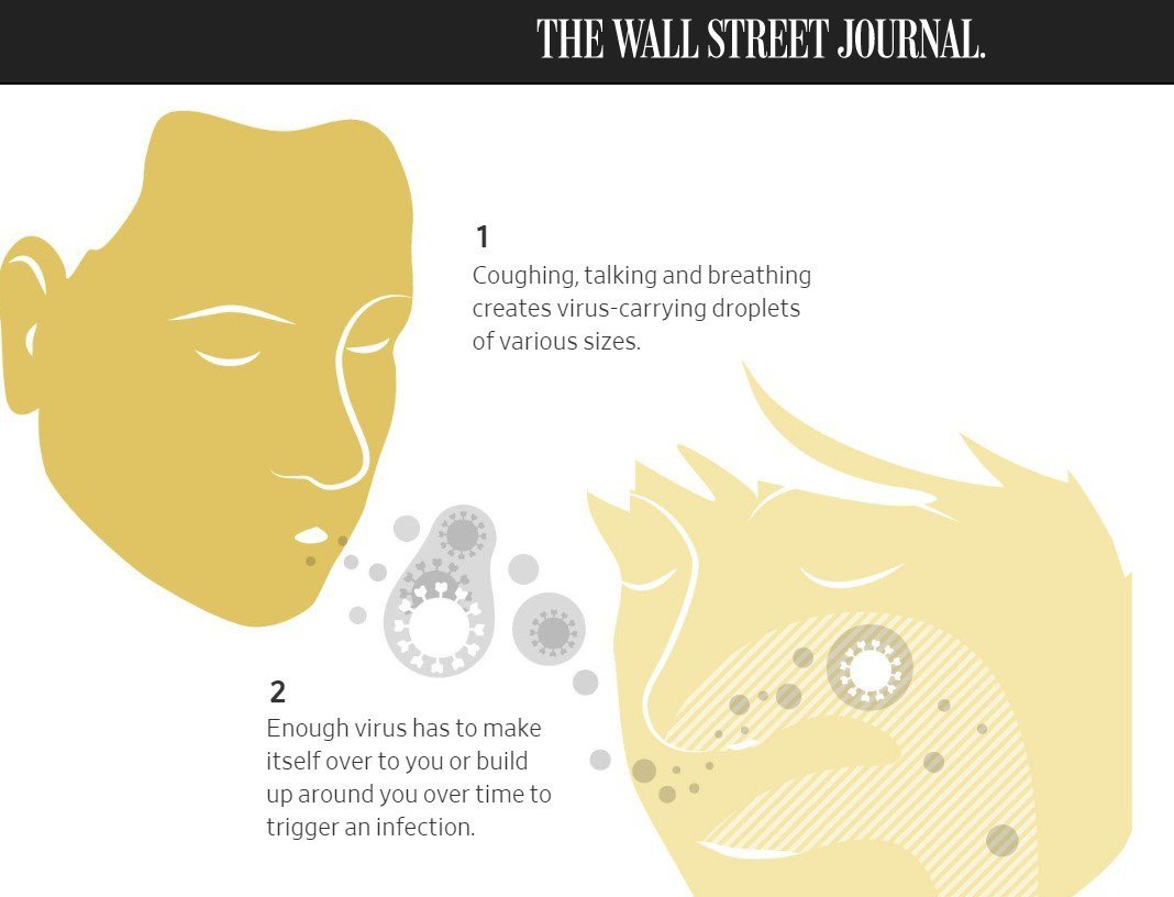 Важливим чинником передачі хвороби є те, що такі начебто добропорядні види діяльності, як розмови чи дихання, також утворюють респіраторні часточки різних розмірів, які поширюються вздовж потоків повітря й потенційно інфікують людей поряд.Установи, що займаються охороною здоров'я, визначили контакт за допомогою респіраторних краплин як основний спосіб передачі Covid-19. Ці великі рідкі краплини можуть передавати вірус від однієї людини до іншої, якщо потрапляють на слизову очей, носа чи рота. При цьому слід зважити на те, що такі частинки падають на землю чи на інші поверхні доволі швидко.