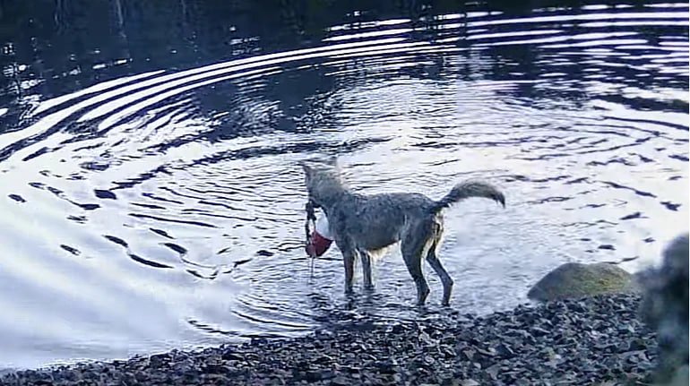 Тому на місці, де встановлювали пастки, поставити камери. Наступного дня вони зняли вовчицю на гарячому. Лише за три хвилини вона пірнула у воду, схопила поплавок пастки та принесла його до берега, де розірвала сітку і з’їла наживку для крабів.